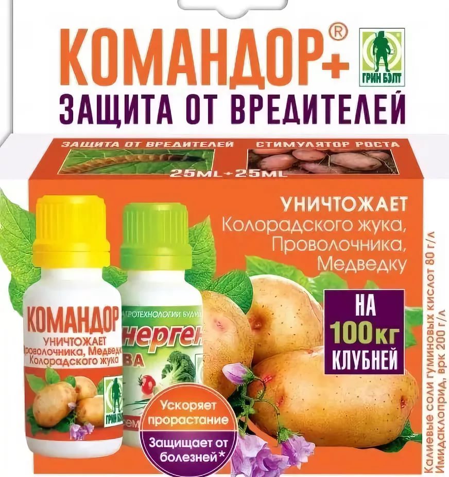 Для обработки клубней перед посадкой. Защищает картофель от проволочника, от колорадского жука и от комплекса болезней.
